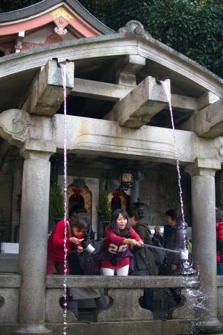 Two women rinsing their hands and mouths with water -- a spiritual purification ritual.