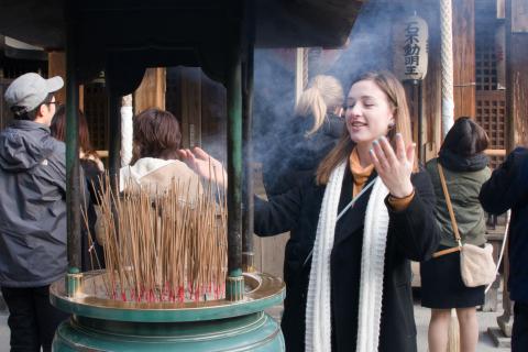 An IES Abroad Nagoya student wafting the smoke from the incense on her. This is thought to have healing powers and is often done near temples.