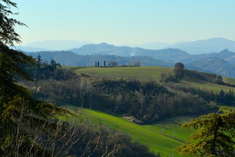 View of the Italian countryside from the Sanctuary of the Madonna of San Luca, a basilica on top of a hill above Bologna