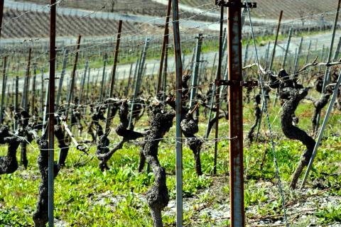 Vineyards early in the growing season in a dry alpine valley in Leuk, Switzerland