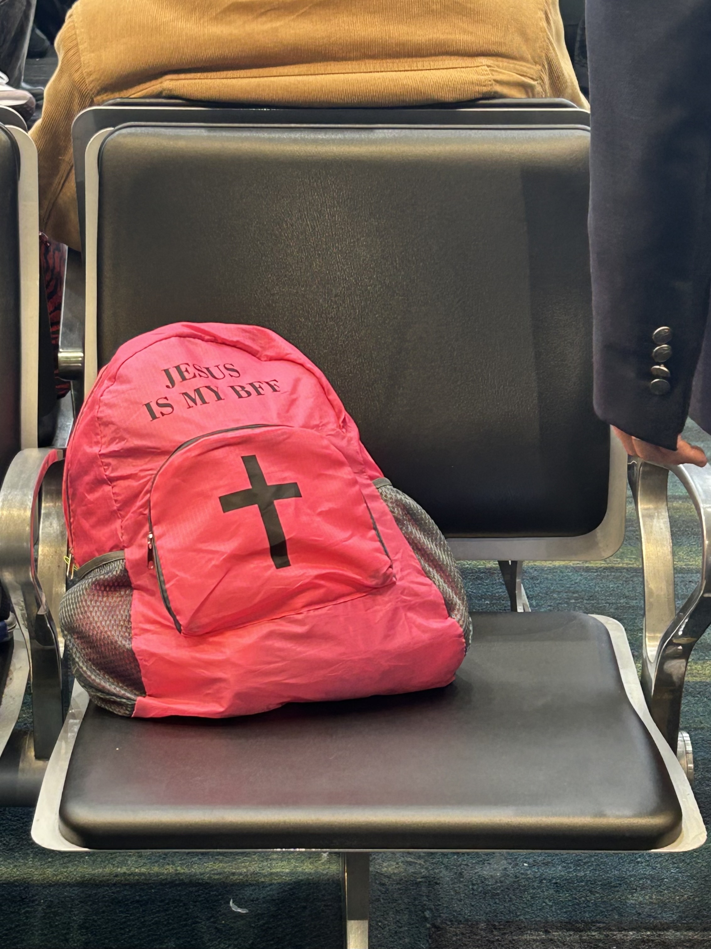 DELAYED. I blinked at the television screen above the gate desk. Simultaneously defeated and relieved, I slipped on my sneakers and went to snuff out a coffee spot. I returned to the gate with a black coffee in a paper cup with no lid, an apparent mandate to finish it off before boarding. For the next forty minutes or so, I sipped my coffee, recounting the past two days of chaos. I stared vacantly ahead at the children’s backpack that sat on the seat across from me. JESUS IS MY BFF. I wondered if I had suffered enough yet to be idolized on a backpack.
