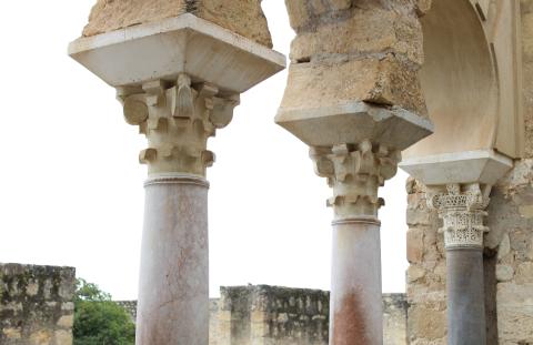 Reconstructed pilars with ornate capitals at the Midnat Al Zahra.