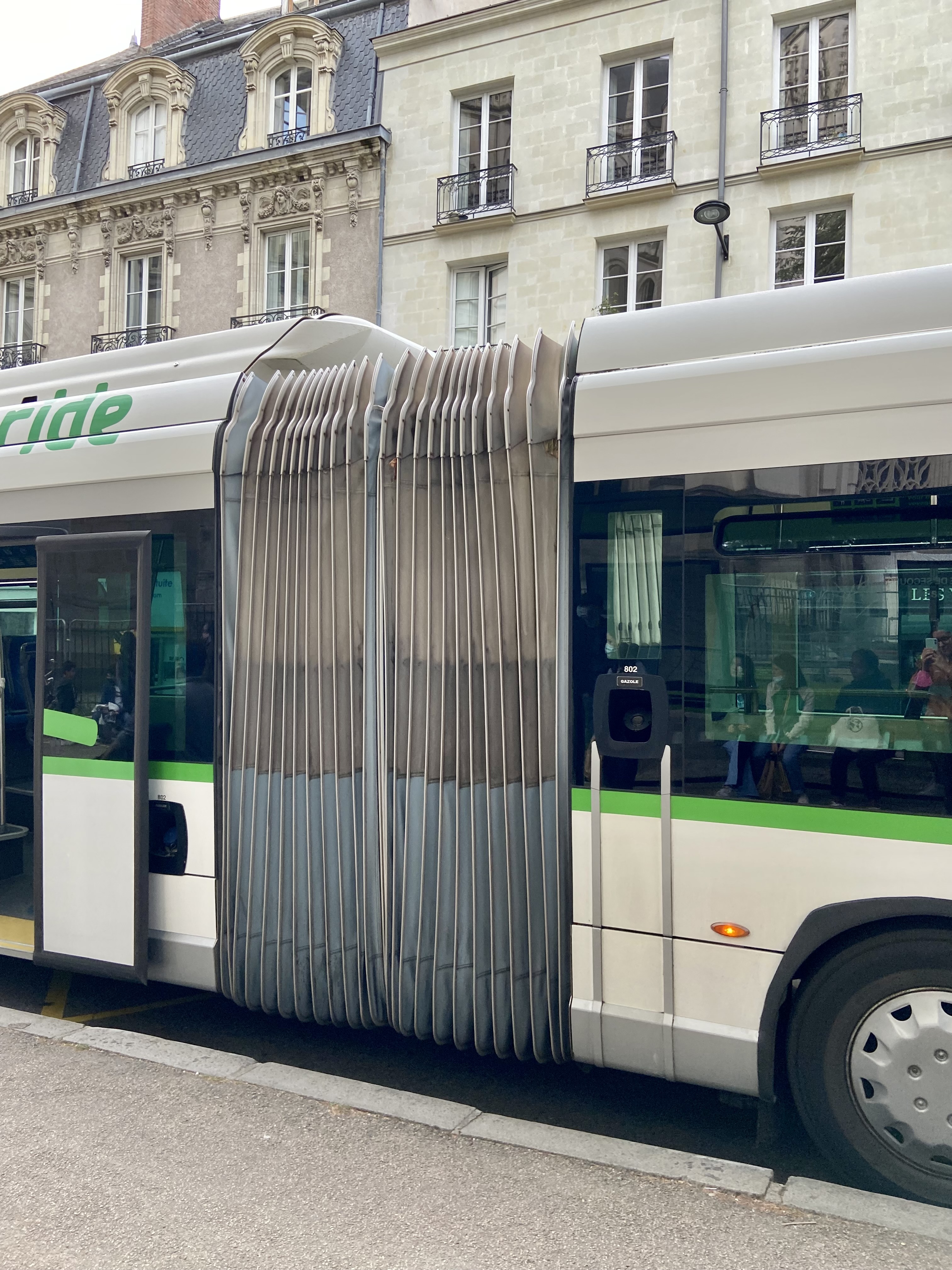 The public transportation system in Nantes is run by a company called “Tan”. The system offers transportation around the city via bus, tram, and even boat to traverse the Loire River that runs through Nantes. The most interesting part of Tan’s modes of transportation to me is the structure of the buses, which is unlike anything I have ever seen. A Tan bus has a segment of malleable pleating on either side of the vehicle, which allows the bus to fold and maneuver tight turns. It seems to me that these buses have been created with a goal of coexistence between old, narrow French roads and modern, spacious public transportation. It is a rather intelligent and logical solution to this dilemma in my opinion. Perhaps it is a small design detail to some, but it certainly had my jaw dropping when I took my first ride on a Tan bus.