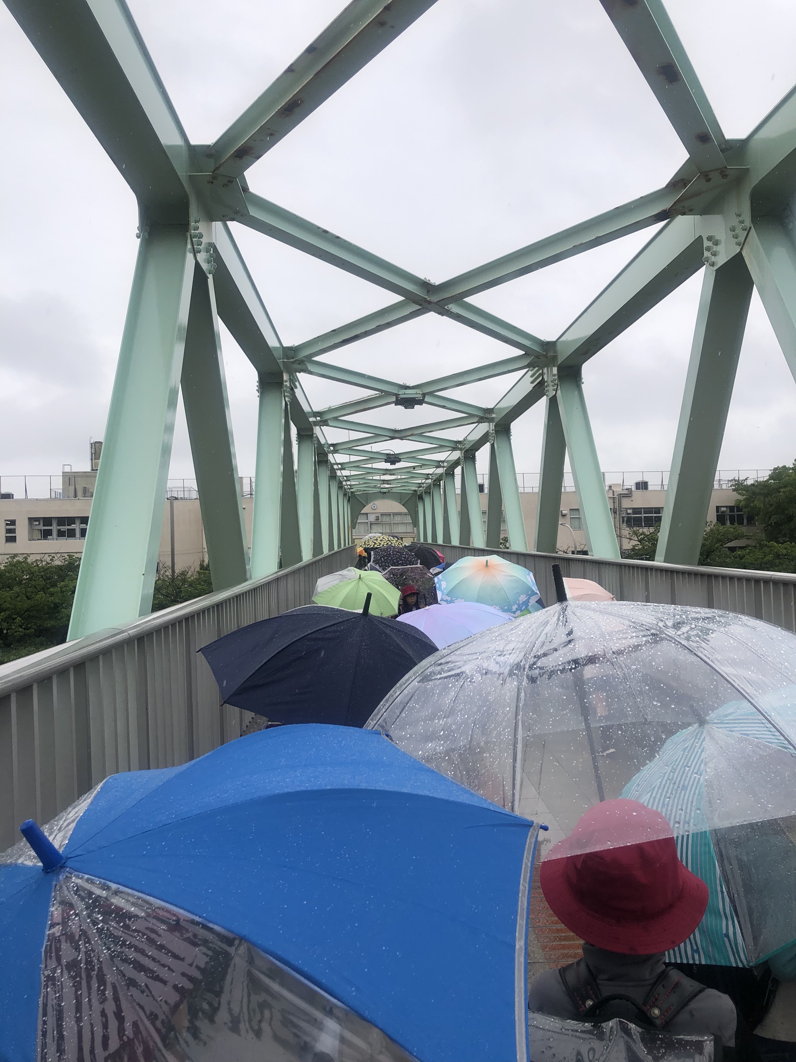 In the morning, when it rains, children walking across the bridge waddle with umbrellas twice their size. It's nerve-racking to dance around plastic shells up to your waist while trying to get to the train station. The streets can easily flood; I've seen people in flip-flops and heels trudging through water the size of a small pond. It becomes a test of how much you care about keeping your shoes dry versus running late.