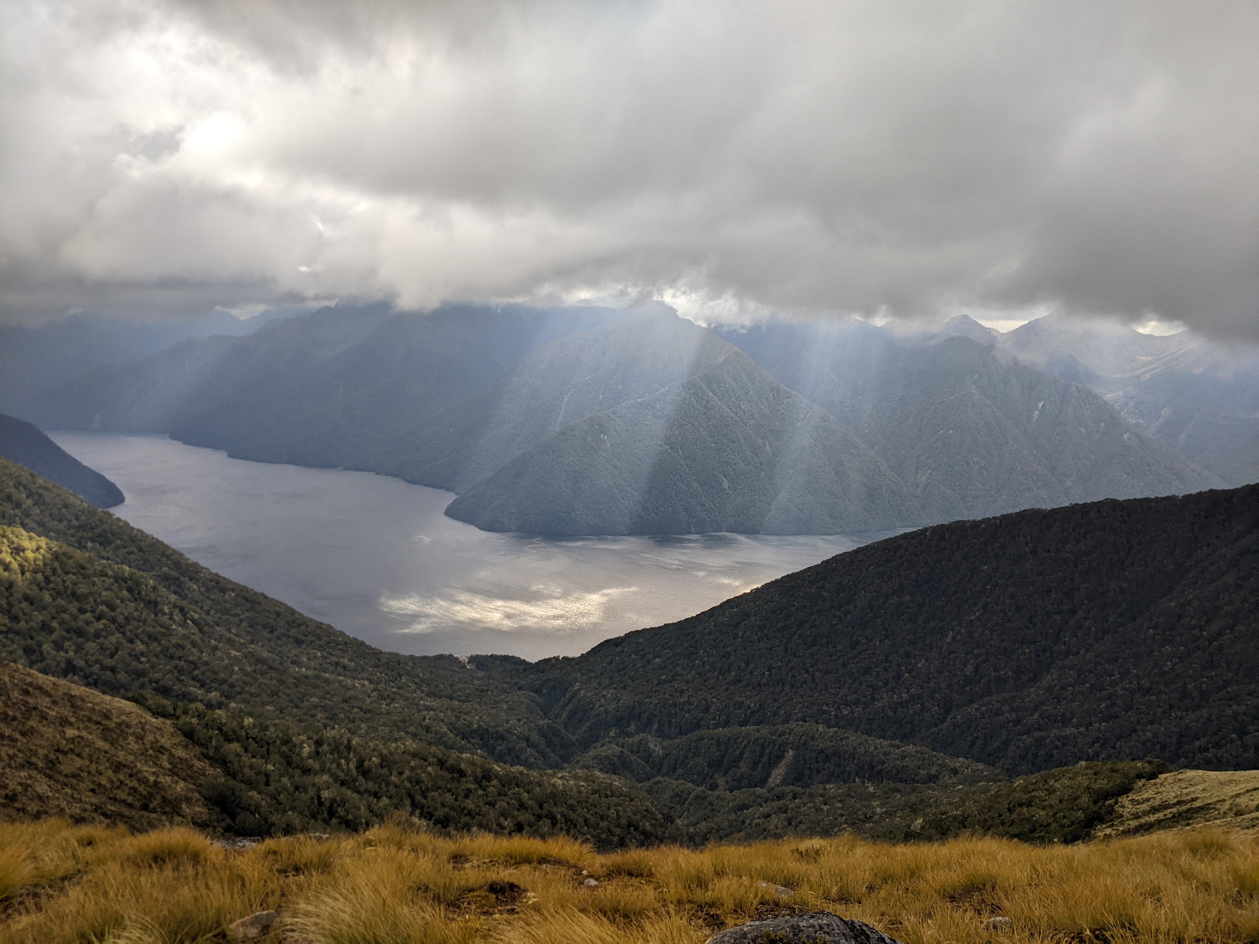- 360° of VIEWS: Based on a suggestion from Greg after he heard about the weather forecast, I decided to drop my bag off at the hut and then continue hiking past it to the summit of Mt Luxmore, the highest point on the trail. That way I could see the views before it all clouded in the next day. Coming out of Greg’s mouth, the idea of hiking “only” an additional hour to the summit seemed straightforward enough, but what he didn’t mention was that that section is one of the steepest parts of the track. However, without my heavy pack weighing me down (I only brought my emergency gear and some water), I felt like an agile little mountain goat and made good time to the summit and back. Even though it added two hours and about four more miles onto my hike that day, I was glad I did it. From the summit, I could see everything from the dark blue expanse of Lake Te Anau to the entirety of the tiny town and the plains beyond it to the mountains stretching into the distance, some of their summits shrouded in puffy clouds. Occasionally beams of “god light” would shoot down through the clouds, illuminating patches of the lake and the alpine landscape like a spotlight. My adventure to the summit was completed with a wonderful view of some Kea, squawking and calling to each other as they soared through the air before finding a rocky perch near the summit.