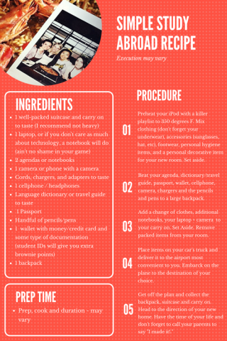 For this blog post, I wanted to make something different. So I decided to create a little recipe/guide for the basic stuff you need to get together before studying abroad. Of course, I made a super simple recipe, and as I wrote in the recipe - "procedure may vary." For those of you reading this prior to your abroad experience, I'm incredibly excited for you! Good luck, and you got this! Go on and make some of the best memories of your life.