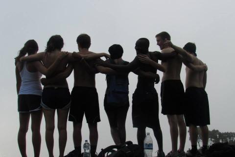 Relaxing and waiting for the clouds to clear up. We were proud of each other for making it almost to the top!