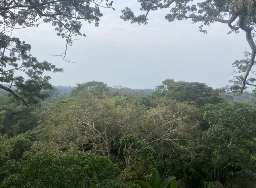 The next morning we woke up early for another hike around the station’s densely forested trails. We stopped frequently to admire fruits, insects, mushrooms, and various other contents of the jungle until we reached a high tower peaking through the canopy. We climbed dozens of flights of stairs and eventually made it to a platform at the treeline. We saw the whole expanse of the forest, the clouds, the strings of leaves falling from the treetops, the river. It was nice to be above the trees after being so enclosed within the trees. We saw a lot of birds, most of whose names I already forgot, but certainly one toucan, which was definitely the coolest. After descending the tower, climbing a tree, and walking over some hilly terrain, we reached an area of the forest that was only sparsely covered with plants. Our guide told us it was because ants managed to make their way into the branches of these plants, and they were so acidic that they prevented others from growing. He opened up the branch of a small tree nearby and it exploded with ants. For reasons I’m still not sure of, our guide had us eat some of these ants, which coated our mouths with a sharp lemony flavor. We made our way back through the forest, splashing through a pool of water, crossing logs, and admiring trees so large its roots looked like walls.