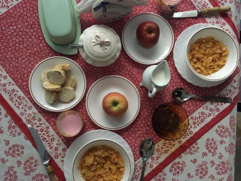 9:15-9:45: Eat a spread of breakfast goods—toast, corn flakes, yogurt, fruit, and tea. Hanna and I had mentioned typical breakfast foods we on the first day and, now, we eat these five things every morning.