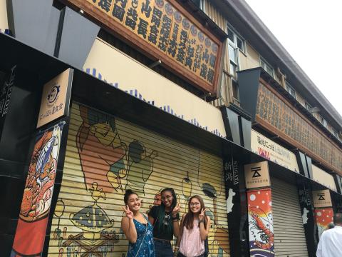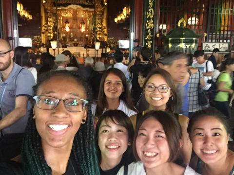 Our second stop was Asakusa. We gathered outside Kaminarimon (雷門, "Thunder Gate"). I marveled at the bold gateway guiding the bustling outside world into the Buddhist temple, Senso-ji. The path to Senso-ji was lined by rows and rows of stores selling wares from ukiyo-e prints, to tenugui, the traditional Japanese washcloths. Another IES Abroad student, Katie, my e-pal, Naomi, and I decided to split a package of azuki manju. As we unwrapped the manju, fresh off the stove, the shopkeepers asked us to please eat outside of the store in order to prevent littering (FYI, you’re not allowed to walk around and eat!).