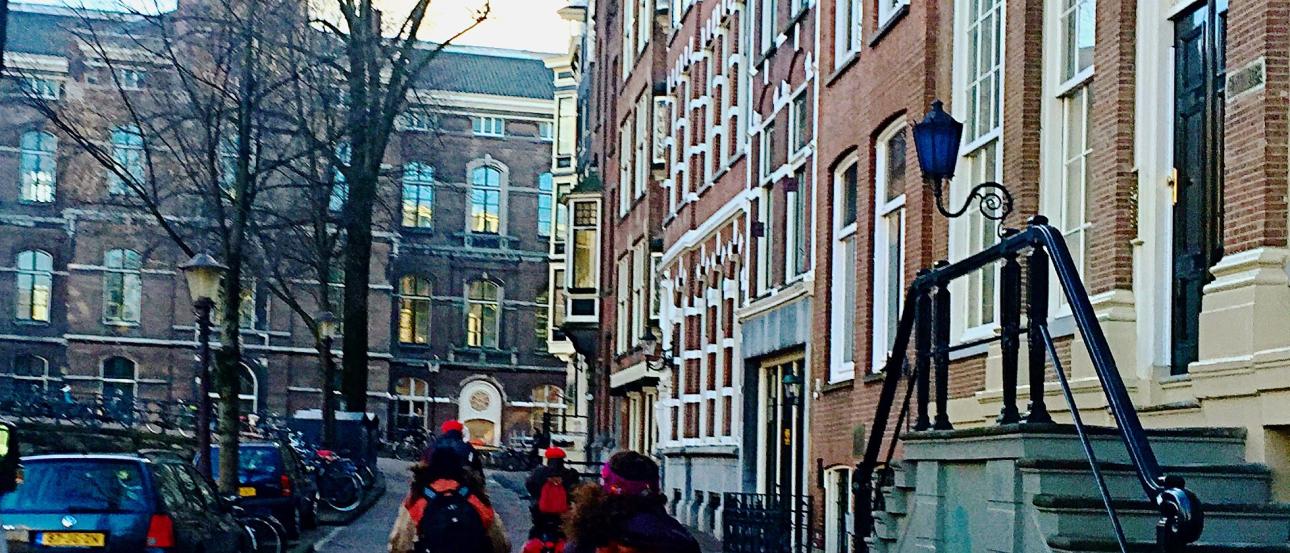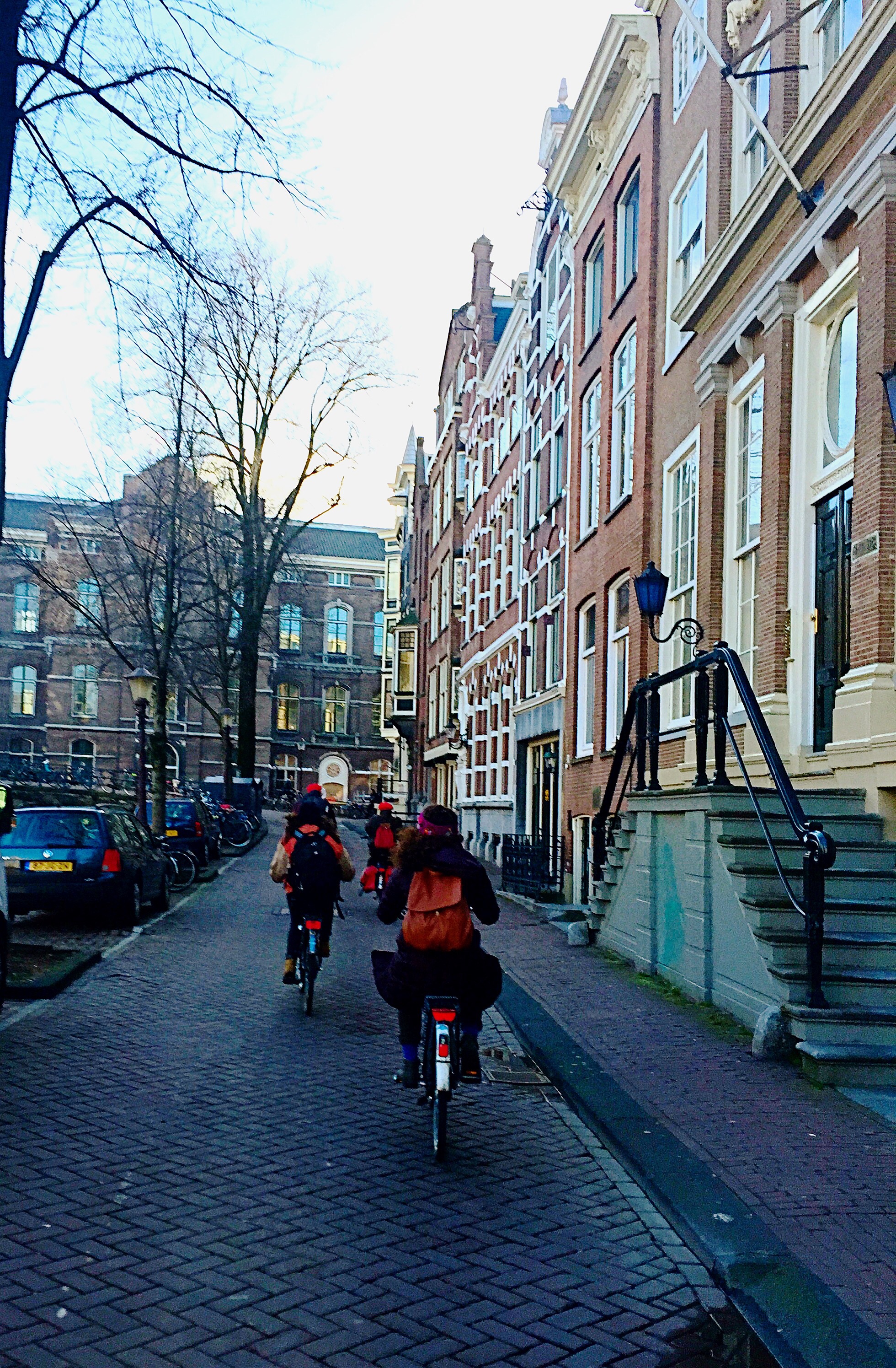 I am getting a little old fashioned with the Gone with the Wind quote, above. Delftware is a type of pottery that is widely popular in Amsterdam or at least used to be popular. Now, it is mostly made for touristy individuals like myself. You have probably seen in in your grandparent's house or your nearest Hallmark store. Regardless, it is a tin-glazed pottery that was extensively traded during the Dutch Golden Age imported from China (thank you, Wikipedia). It usually depicts windmills, landscapes, or (my favorite) two adorable children shyly kissing one another for, what appears to be, the first time. There are several of these delftware stores around Amsterdam and I am a victim of succumbing to this tourist tactic. I'm not even ashamed. This last week included more exploring (or, also, what I like to call getting lost), eating endless pastries (I should really get in control), visiting museums and old churches (because there are far too many to count), and attending class (oh, I suppose class is important). I was lucky enough to spend my Friday visiting the Van Gogh museum. This was a bit of an excursion even though it is only fifteen minutes from the apartment. It just happened to be raining when I was riding and the wind was cold and unforgiving (I love you too, Amsterdam). Finally, I reached my destination and walked into the museum possibly resembling a wet dog. I bought a guided tour (because I get really paranoid reading descriptions thinking that I am taking too long) and made my way around the three story building. It goes without saying that the trip was completely worth the cold and wet ride, even though I caught a cold the next day. Tuesday, I made my way to my Dutch Art class. The moment I walked in the building, I was greeted by sparkling pastries on the table (I somehow convinced myself I would burn it off while biking). We indulged and then made our way into the city after a quick lecture on the weekly topic. We weaved through the brick terrain to our chosen destinations which included Our Lord in the Attic (a Catholic church, literally, in an attic) and a quiet courtyard in the center of the city. While I enjoyed exploring these new sights, I want to point out something that really took my breath away. While riding through Amsterdam you will encounter some things that are out of the blue. That day, I rode past a women probably making her way back from work. Situated in a tiny blue crate on the back of her bike was an Australian Shepard that appeared to be twice the size of the crate. Honestly, he seemed pretty happy just cruising around in a basket that was half his size.