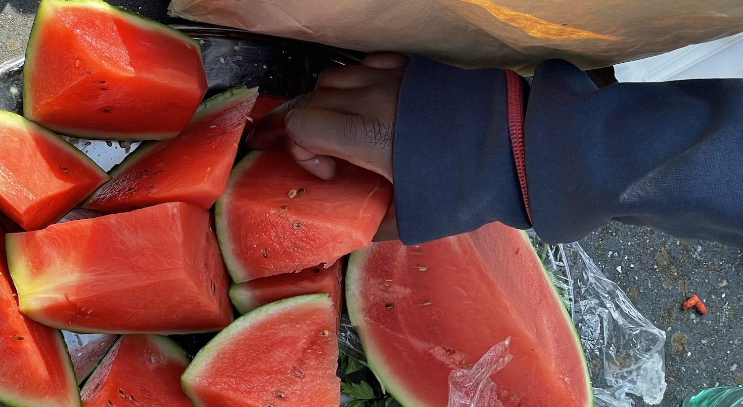 The group parked it on a slope with a long cement bench on which we could lay out all the food: Ryan’s mom’s Moroccan samosas, shrimp chips, and baklava, Michele’s jumbo bags of popcorn and paprika Lays, Rachel’s bucket of KFC, Amy’s son’s homemade fried rice, and Dmitrius’ English cookies and muffins. I added my green grapes, Oreos, and Hot Cheetos, the latter bag snatched in an instant, passed between them until all their fingers were red and cheesy. A ball game ensued, horde of shouting kids racing back and forth on the grass, trying to catch the ball from their teammates as many times as possible before someone from the other team intercepted and the count restarted. Their teacher eventually brought out watermelon and blue and pink popsicles. The sweaty lot of students hunkered down on the rock pile at the top, faking pushing each other off, bright blue popsicle dripping down their hands. We took a group pic amongst the rocks, me and the other volunteers sitting properly at the base, while a ring of rambunctious students constantly messing with each other stood around us, half smiling, half shouting at one another. Picture over with, the boys flooded down the hill again and started playing soccer, while the girls shared the giant bag of popcorn in the shade.