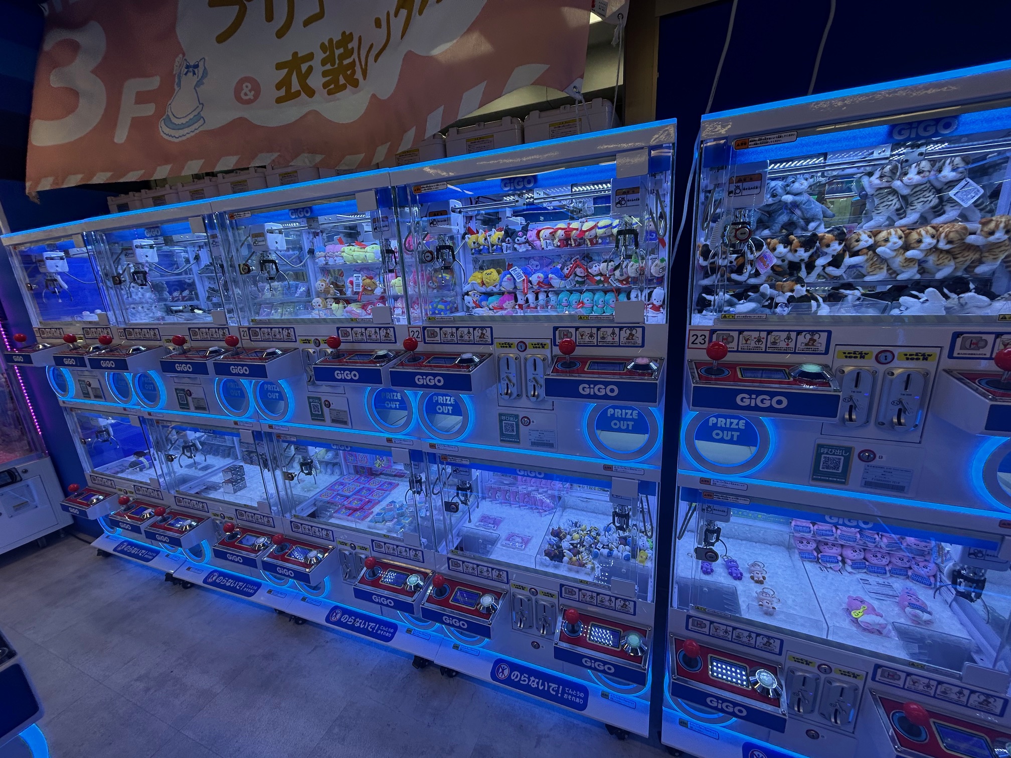 I recommend bringing a coin purse, because the machines only take 100-yen coins. I’d head to an ATM beforehand to make sure you have enough cash. The arcades do have exchange machines for Japanese bills to 100-yen coins, but don’t tend to have an ATM.