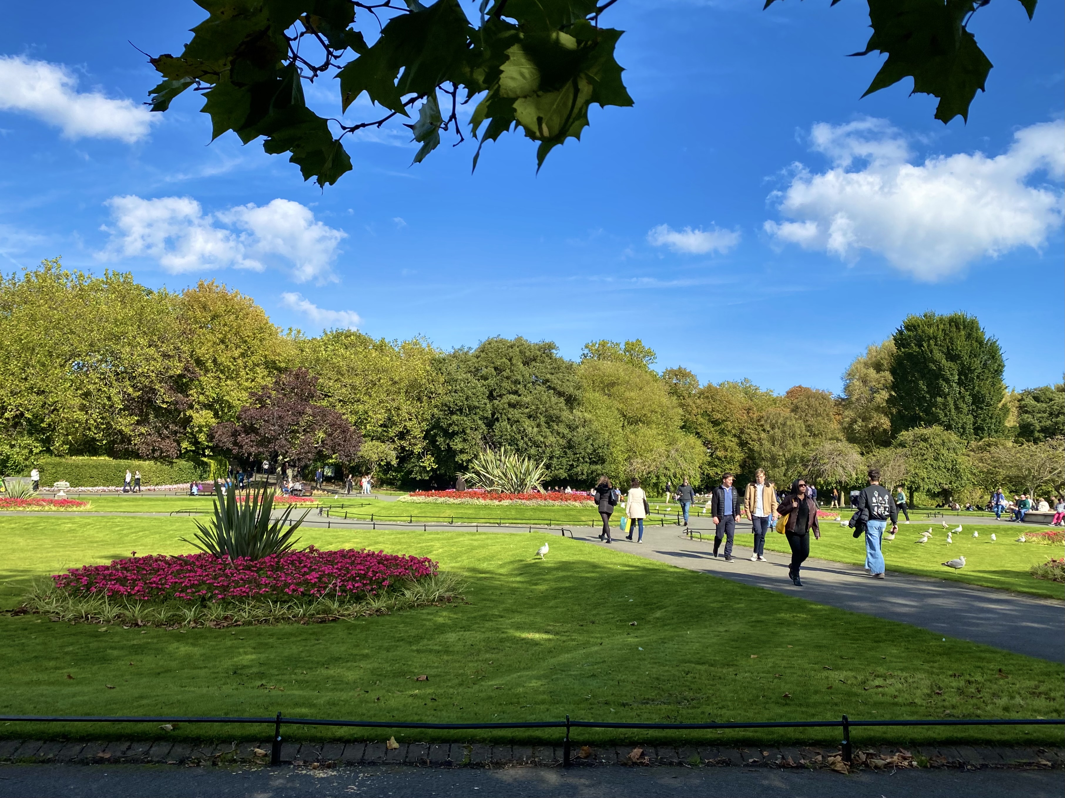 First of all, I needed to get out of my room where it is all too easy to wallow. Sounds obvious, but it can be a challenge to emerge from a blanket cocoon when feeling overwhelmed, especially in a foreign place. I am sure I am not alone when I say I need the promise of coffee to get out of bed, even when I’m not homesick. Though it’s recommended to avoid familiar chain-stores when abroad, I had to go to Starbucks. It is Fall, and little seems more American than having a Pumpkin Spice something. To sweeten the deal, I chose the Starbucks closest to St. Stephen’s Green, so I could have a ramble after enjoying a Pumpkin Spice Frappuccino.