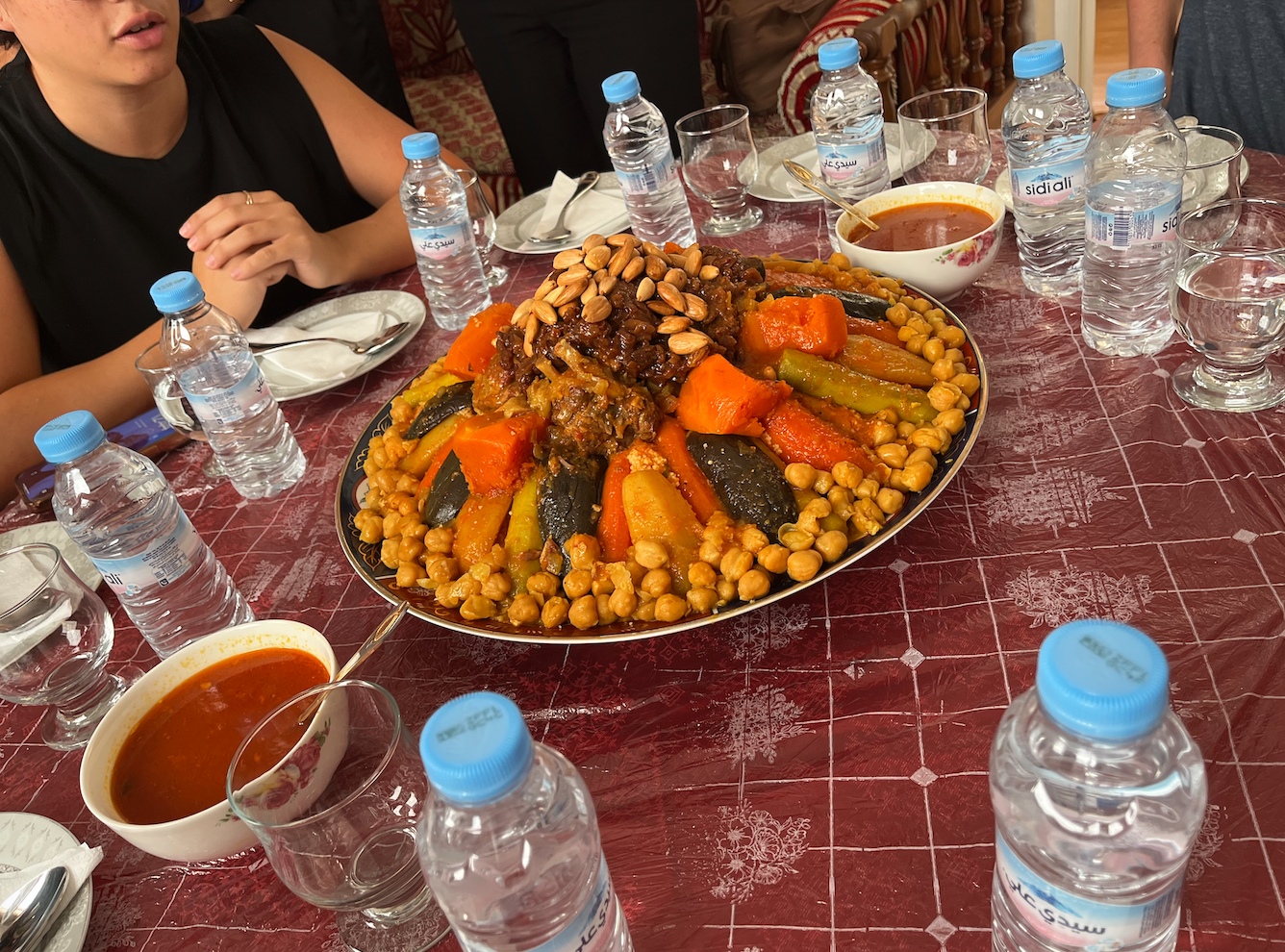 Breakfast in my family is usually tea, meloui, and harcha or beghrir with a selection of butter, white cheese, amalou, strawberry jam, apricot jam, and olive oil. Lunch is typically a packed lunch which can vary and couscous or other bigger dishes on the weekends. Dinner can be anything from pasta to tagine depending on what the “vibe” is. Lunch tends to be the biggest meal of the day and dinner is lighter. Also, dessert is rather common and it normally contains some kind of nut so beware my friends with nut allergies. Nuts are also used as garnish for several types of tagines so my advice would be to always ask whoever made the food to verify that there will be no nuts in your meal if you have an allergy. If you do not know french or arabic, keep a screenshot of a translation into arabic stating your allergy. Vegetarianism or veganism is also a very hard lifestyle to continue in Morocco as many of the most traditional dishes revolve around meat. I, personally, made the choice to pause my vegetarianism while in Morocco and I believe I made the best choice for me.