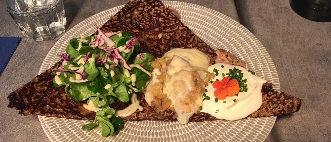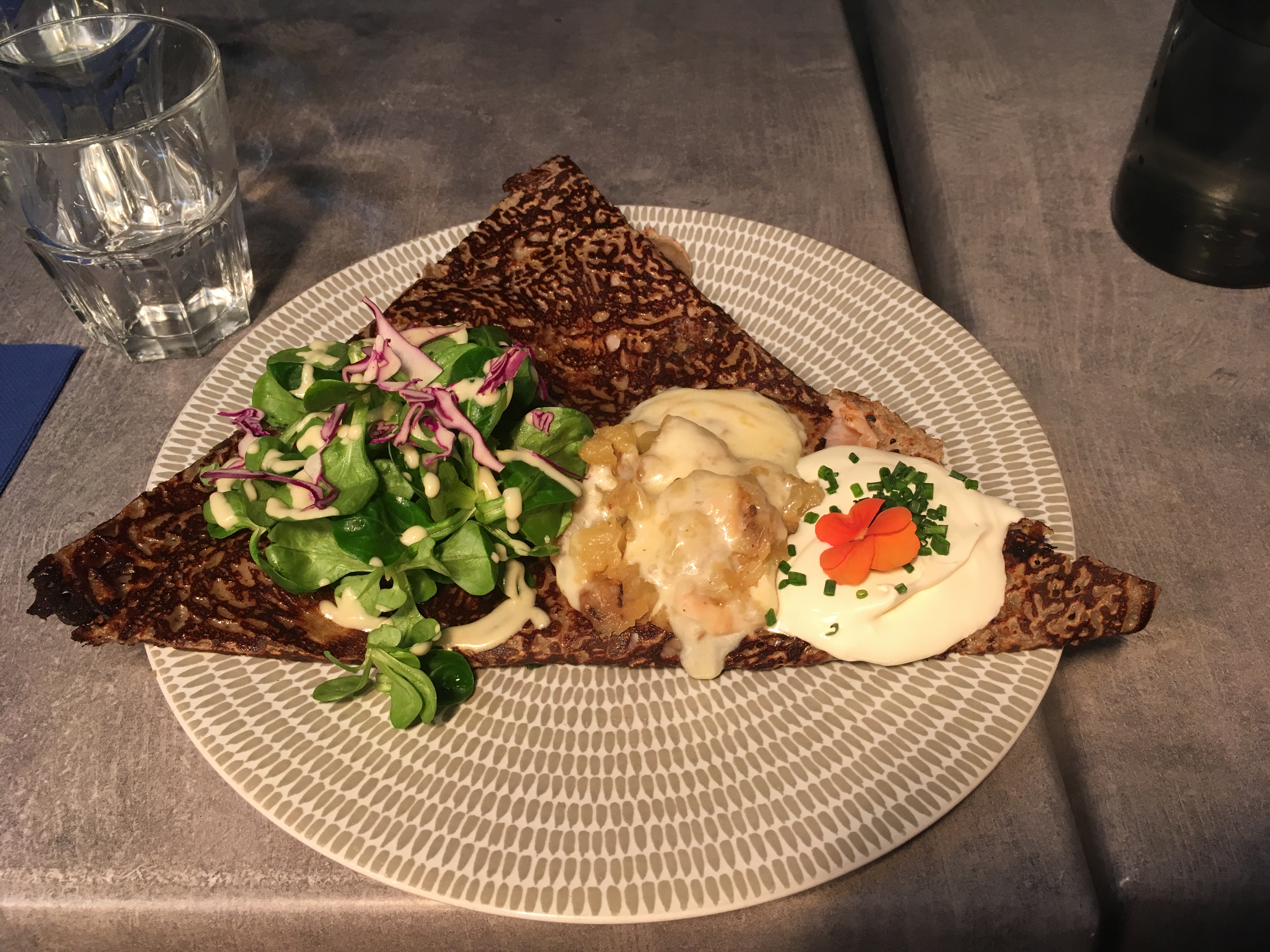 4. Galettes: These are another specialty of Brittany/Nantes that I’ve referenced in other posts. Galettes look a lot like crêpes, except they’re made with a different kind of wheat, called black wheat (blé noir). So, galettes have a different taste from crêpes—they’re the savory cousins. They’re generally the main dish of a meal, filled with ham, cheese, egg, mushroom, vegetables, smoked salmon, or some combination of everything. Crêpes are then reserved for holding more sweet entities for dessert.