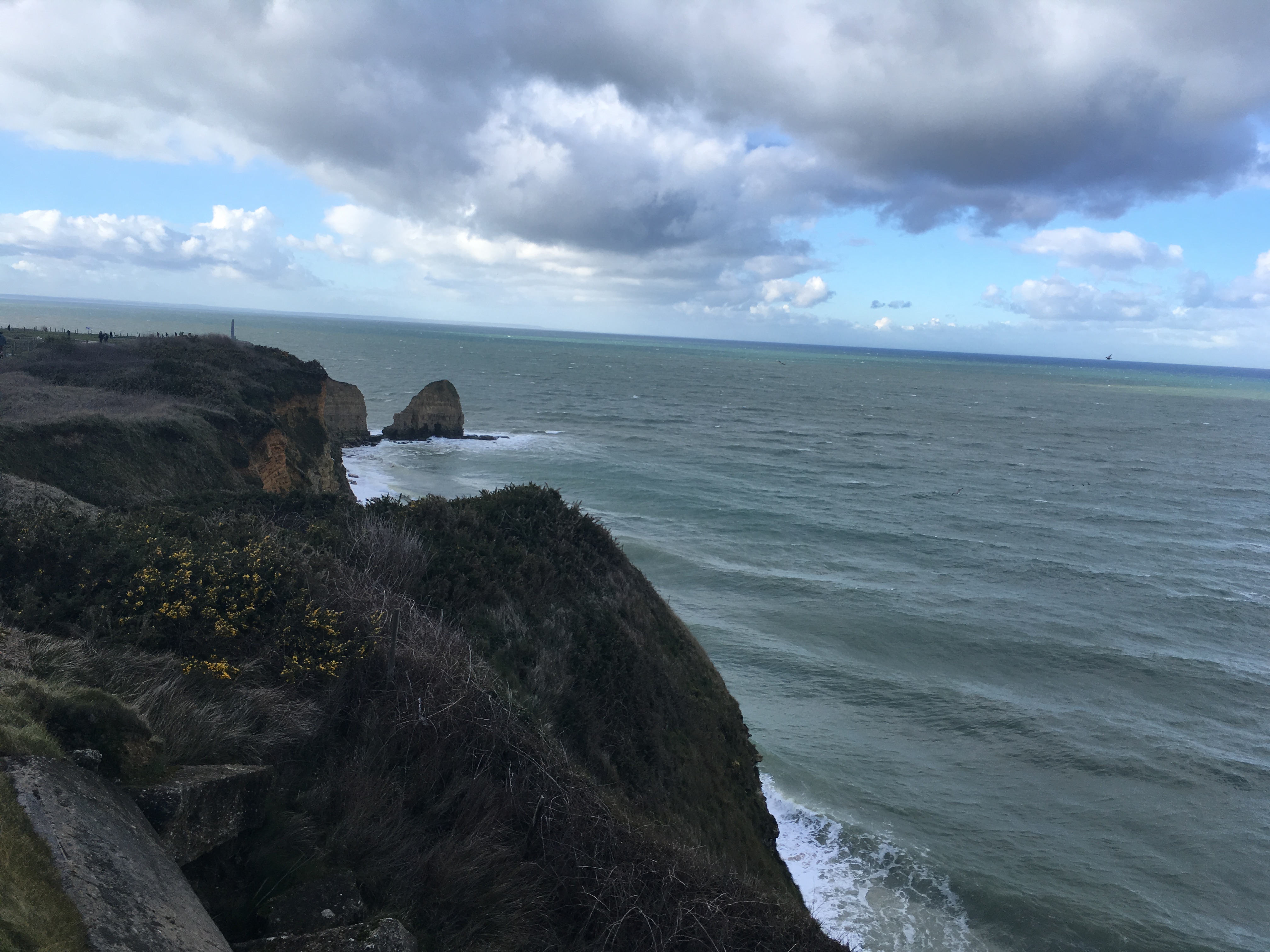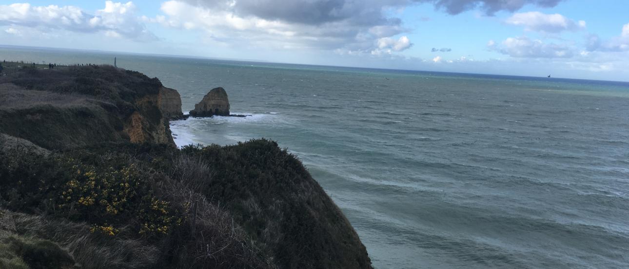 Our bus voyage Sunday afternoon was to the Normandy American Cemetery, a cemetery created for those who fought in WWII. Photographs I’d seen of the thousands of white crosses here did not do justice to the actual enormity of the cemetery. It was a well-done tribute, but a heartbreaking one nonetheless. The sheer quantity of soldiers who’d fought in the war is a number I don’t know if I’ll ever be able to fully understand. The cemetery overlooks the English Channel and the rocky cliffs of Normandy, which is breathtaking. After this heavy visit, we visited an equally intense place—Pointe du Hoc. This was the American’s position in trenches along the high cliffs of Normandy, overlooking Omaha Beach. It was incredibly windy as we were completely exposed on the flat land overlooking the ocean. The trenches are open to enter, so we wandered through the many different hidden cement rooms—low ceilings, metal storage hooks, small windows, and narrow doorways. The land was carved in wide, 10-foot-deep holes all along the coast.