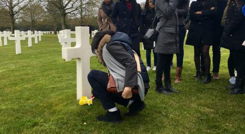 IES Abroad Paris BIA has a tradition of leaving flowers for Monsieur Quinones. A couple of years ago, one of the students in the program went on the Normandy trip and told one of the program advisors, Nathalie perhaps, that his grandfather's brother fought in WWII and was buried in Normandy. His family had always wanted to visit but it just never worked out. During his field trip, one of our advisors called the American cemetery prior to their visit to see if Monsieur Quinones was buried there but they said no. The student was obviously upset but he didn't show it. When they arrived at the memorial, the workers at the visitor's center noticed the program group and got excited. They had, in fact, found the boy's great-uncle. They gave him the row number and he went with the advisors to find the gravestone. He took a picture there and expressed his gratitude to the program advisors for helping him visit his relative. He had promised his grandmother that he would get a picture with the grave since she couldn't visit herself. She, at the time, was already in her late 90's. Ever since then, the program has left flowers at the student's great-uncle's grave at every Normandy field trip. This program is remarkable for being able to build such strong, lasting ties between their American students and France.