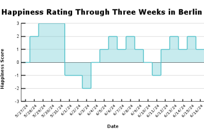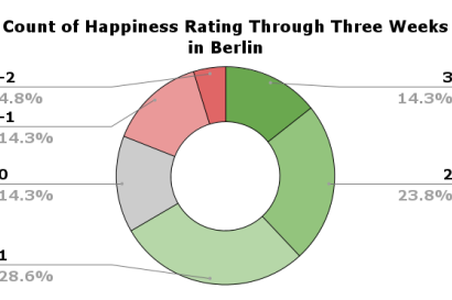 There are certainly a few more mediocre days, like one I rated -1 on June 11th when a fire alarm woke me up at 8:00 AM and threw off the flow of my day. Although days like that get overshadowed by the majority of wonderful memories. My average score per day is 0.95, good for days being above average consistently. Although, I didn’t even need the data to tell me how I have already been feeling. I can already confidently report back on my happiness to have made the “leap of faith” into the unknown. Going abroad creates a well of experiences and memories that I can already tell are to last me a lifetime. I look forward to making plenty more in the next few weeks and report new data back in a few weeks. Tschüss!