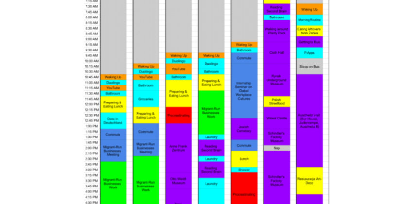When we think of resources in life, usually we think of essentials like food or water. Yet, I think time should also be included into one of the most important resources. We, as people, are continuously progressing forward in our lives, with no way backward. All we can do is maximize the time we have. For me, it is 1440.83 hours. That is how much time I have in Germany. May 28th to July 27th. A friend of mine said “Don’t remind me it is week six. It’s almost over.” However, I see it differently. I see it as a point of motivation to fall back on. I think about all that I still want to do with the time left. This brings us to the last topic for Data in Deutschland: Time. Here, I hope to present a minute-by-minute account of being abroad. All the highlights, lowlights, and minutiae between. The next section, “How it Works,” outlines the process behind the data, but if you are simply interested in seeing what went on during my time in week six of being abroad, skip to the next section labeled, “The Daily Life.”