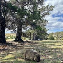 It was dark and rainy when we got off the ferry. We took a quick stop for the bathrooms then promptly began our walk. I hardly noticed, but the clouds quickly disappeared to reveal a blue, sunny sky. Immediately, we saw pademelons and wallabies. As we were walking, we spotted a wombat by a tree at the top of the hill. Our guide invited us to go up to get a closer look, and we realized the wombat had a baby with her!! At that moment, my life felt complete. While my first couple days consisted of experiencing things alone, it was really nice to feel the joy of getting to see a wombat for the first time with others. The wombats looked like most innocent little fluff balls and I just wanted to pick them up, though they did seem quite dense and can get aggressive. We watched them make their way down the hill and continued on our way.