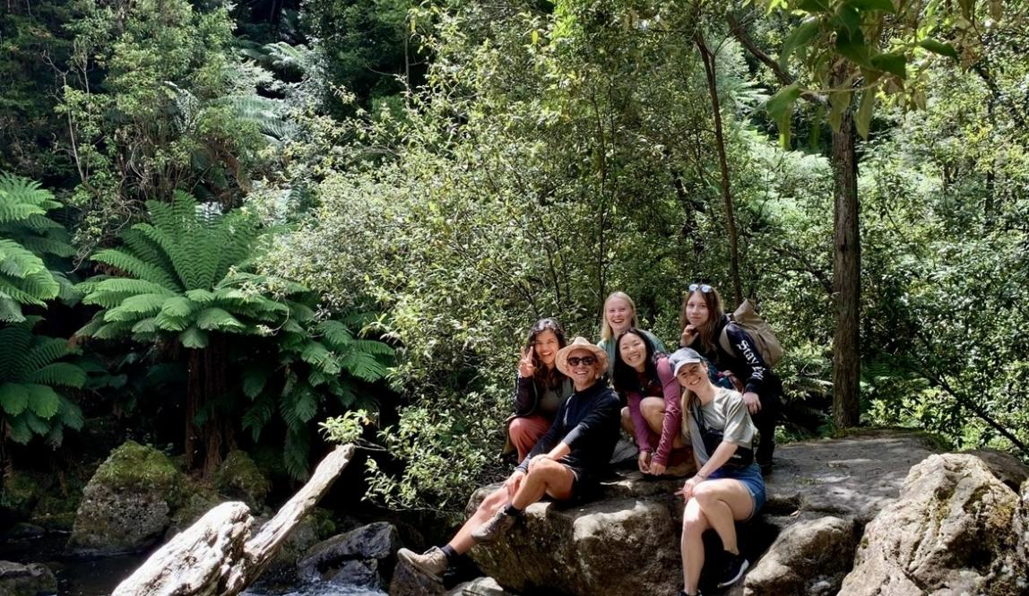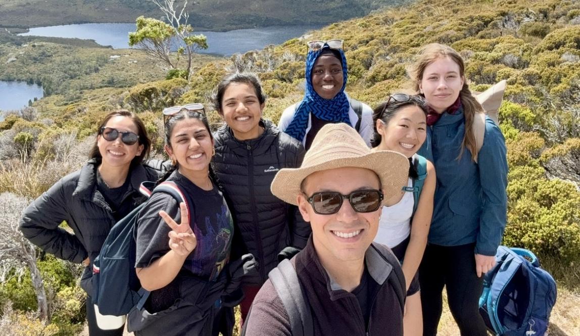 We drove a short distance to the Cape Tourville lighthouse, where we saw a wallaby up close and walked to a platform overlooking the Tasman Sea and small granite islets called “The Nuggets.” We drove another short distance to a beach near the visitor center that looked out at Coles Bay. This was the beginning of what would become hundreds of group photos together.