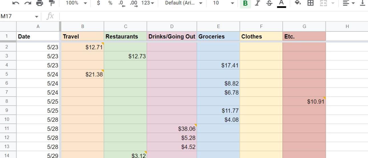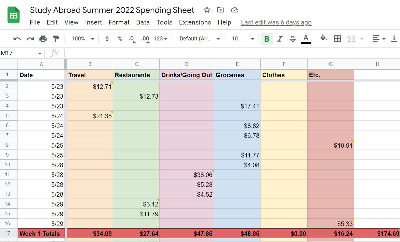 For me, finances were an important part of deciding where and how I was going to study abroad and I couldn't find very many helpful resources that gave me an idea of what my finances would actually look like abroad. There are lots of budgeting sheets and expense projections out there but they all seemed so vague to me. This summer I decided to record and categorize every purchase I made so that after the program was over, I could help other people get an idea of what their expenses may look like as well.