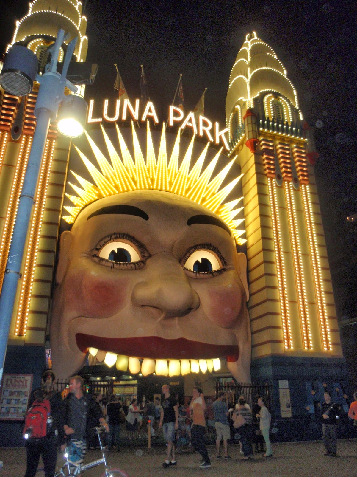 Keeping up with my weekly adventures (at least once a week I will do or see something new), I went to Luna Park today. Luna park was first built in 1935. It has a long history of closing down for months because of unsafe rides (no worries, I survived) or noise pollution complaints and moving to different destinations , but it has now been open since 2004 by the Harbour right across from Darling Harbour and the Opera House. It is the well known giant face and has been the location of many movies and tv shows. The government actually protects the park and its buildings for their cultural and historical significance. I went with a huge group of friends, with an unlimited ride pass. They are all older and smaller rides, but it was a great night. My head aches from all of the spinning! There was this one ride that looks like a giant washing machine (the ones that you put clothes in the top). The ride spins so fast that you are stuck to the wall and then they lower the floor so that you are hanging on the wall held up only by the centripetal force. Great idea for a ride! It was a lot of fun.
