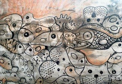 A name to know when discovering graffiti in Granada is el niño de las pinturas, also known as Raúl Ruiz. *Born in Granada, Ruiz has produced and left his mark on cities all over Spain as well as other countries around the world, such as Portugal, the UK, France, Italy, Argentina, Venezuela, and Mexico to name a few. It is understandable when seeing his works why he has risen to such success – his stunning productions encourage intense, pensive reflection, often containing figures combined with a word or a phrase. For example, pictured below is a painting by Ruiz with two people, one appearing more youthful and the other elder, engaged in different activities. Between them in mechanically loose, stenciled font is written “estamos,” which is actually the easiest word in the pintura to read. Characteristically in the works of el niño de las pinturas, there are words which are too sun-faded or worn away with time to be legible. So while there are traces of the rest of the phrase on either side of the figures, this is the image which stands out the most to me while walking along the street.