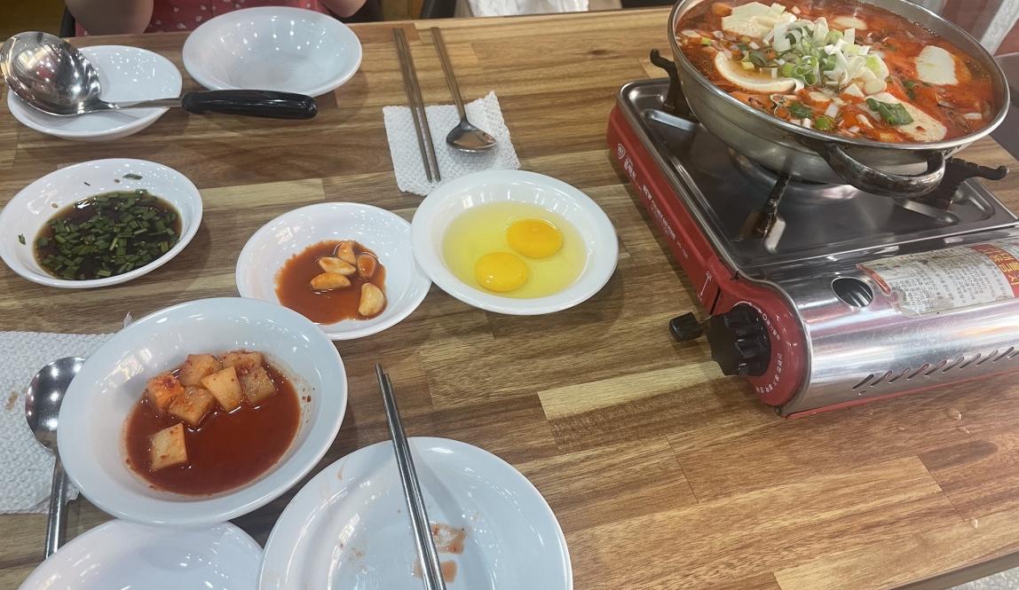 In my few weeks in Korea, I’ve tried a lot of new food. I had gone out for Korean barbecue a couple times while in the US, but I hadn’t really tried “authentic” Korean food or any other Korean dishes beyond what is typically served at American K-BBQ places. So most of the food I’ve had has been very novel. For example, after our trip to the DMZ, we went out to a traditional restaurant in the nearby town of Paju and I had bibimbap for the first time. It was so delicious and a great source of vegetables, which it turns out is kind of hard to find in Korean cuisine. I was also surprised at how many side dishes there were and how quickly I could get full just from the sides (which are called banchan in Korean). These often include kimchi, japchae (glass noodles), kongnamul muchim (soybean sprouts), sigeumchi namul (spinach), and oi muchim (spicy cucumber salad).