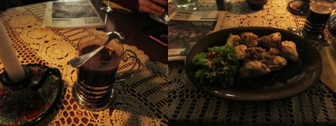 A few friends and I grabbed dinner the second night at the restaurant Konspira, which also acted as a historical education center. We walked through the wardrobe to a “secret” room, where there were shelves with various authentic items from the 80s. It provided information on the anti-communist opposition in Wrocław. The menus were printed in the form of newspapers, giving information about Solidarity. The walls were adorned with political comics and newspaper clippings of the 1980s. I got the “Anti-Communist pierogi,” as well as the kawa biurowa fusiata, which was ground coffee served in the “old-school communist style glass and holding basket.” The food was on the cheaper side (we found it in the Cheap Eats section of our Wrocław In Your Pocket guides), and delicious. They serve traditional food, but often with a twist. The profits they make go to local social projects.