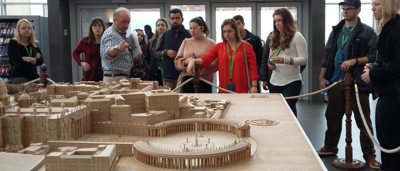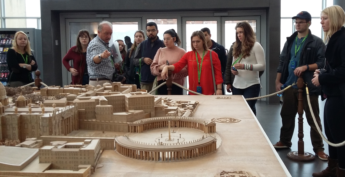 Professor Racioppi introduced students to the history of the Vatican over the centuries. The tour included the rooms of the ancient statuary collection created by Pope Julius II, the founder of the Vatican Museums; the Gallery of Maps in the old Papal Palace, where students admired the fresco of the School of Athens; the Sistine Chapel including the altar wall where The Last Judgment is featured, both of which were frescoed by Michelangelo; and finally Saint Peter’s Basilica where the group admired Michelangelo’s Pietà, and the impressive bronze Baldacchino designed by Gian Lorenzo Bernini.