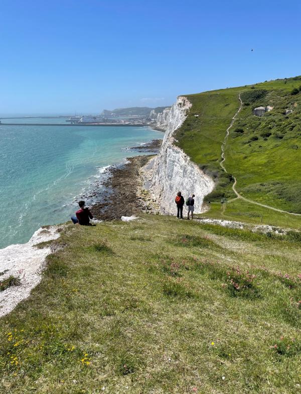Students explore the rocky inclines off the coast of Dover on a sunny day.