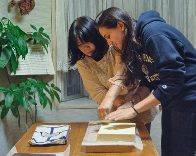 A student and their host mother cut tofu together in a Nagoya Homestay.