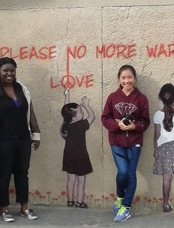 Students stand in front of a mural. The mural depicts two children writing "Please no more war, Love" with red chalk.